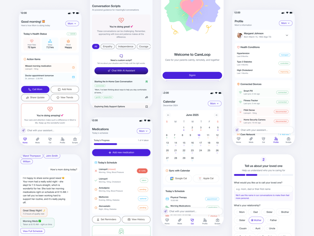 A thoughtfully designed mobile UI kit for caregiving apps. Includes onboarding, login, parent profile, medication schedule, AI chat, and emotional script screens - all focused on remote care with a human touch.